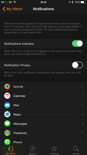 Após o emparelhamento do Apple Watch com o iPhone as notificações estão activas para todas as aplicações, podendo ser desactivado na aplicação do iPhone.