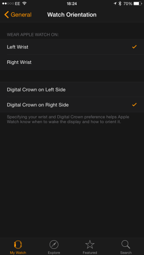 Para aqueles que gostam de utilizar o relógio no pulso direito, não há problema nenhum, na verdade a Apple pensou nisso e é possível na aplicação do Apple Watch no iPhone, alterar a posição do braço o que vai também influenciar a detecção de elevação do pulso.