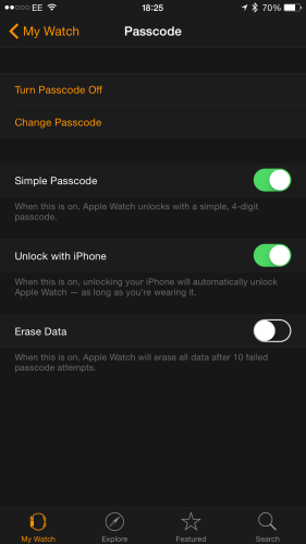 Se a opção de detecção do pulso estiver activada, sempre que o relógio sai do pulso é nos pedido o código para desbloquear o relógio (é possível desactivar tanto o código como a detecção de pulso)