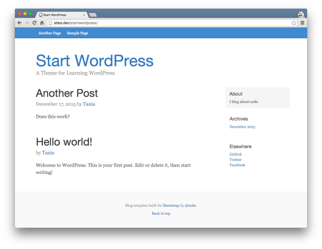 We created this theme using Bootstrap, and more specifically the official generic blog template. While the theme could use custom CSS or any framework, I went with Bootstrap so that we can focus on creating the theme’s function without worrying about the style.