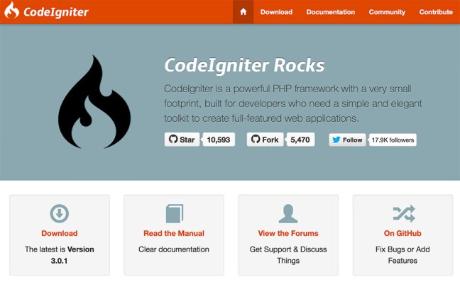 CodeIgniter is a lightweight PHP framework that is almost 10 years old (initially released in 2006). CodeIgniter has a very straightforward installation process that requires only a minimal configuration, so it can save you a lot of hassle. It’s also an ideal choice if you want to avoid PHP version conflict, as it works nicely on almost all shared and dedicated hosting platforms (currently requires only PHP 5.2.4).